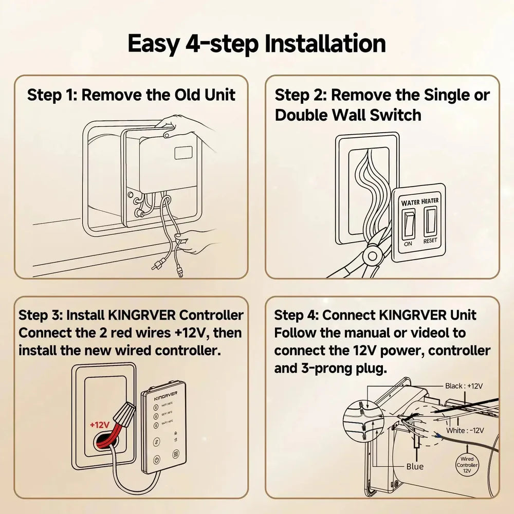 The expanded 18.5″ × 18.1″ enclosure, paired with a universal 18.0″ × 18.0″ access door, fits larger RV compartments and allows for hassle-free upgrades or replacements. The included remote control makes adjusting water temperature simple and convenient from inside your RV.