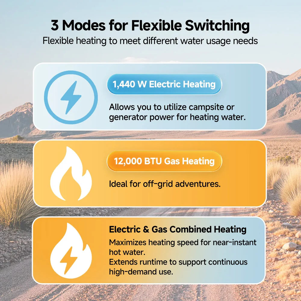 - Features three modes for fast, efficient heating: propane, electric or hybrid.