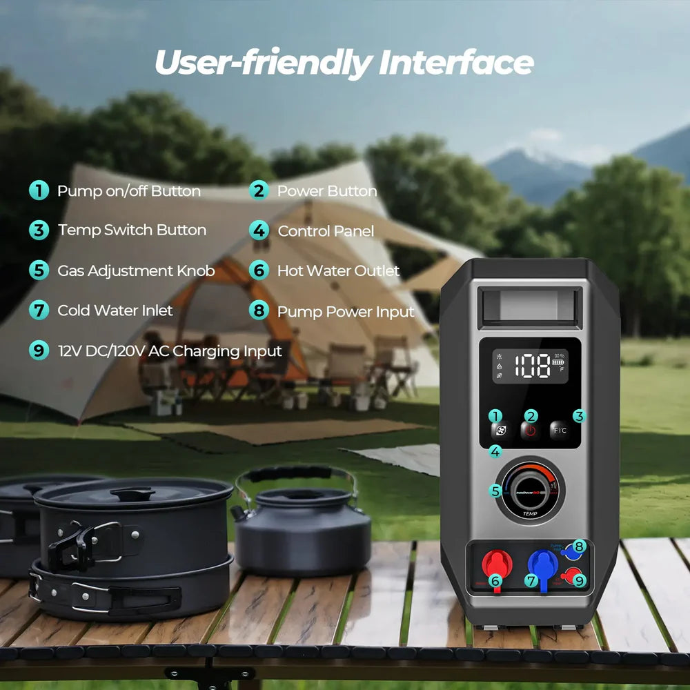 This on-the-go heater connects easily to standard propane tanks and garden hoses, delivering instant, on-demand hot water for showers, dishwashing, or pet baths—no electrical hookup required. Built-in safety features include flame failure protection, overheat protection, and anti-dry burning sensors for reliable, worry-free use in the outdoors.