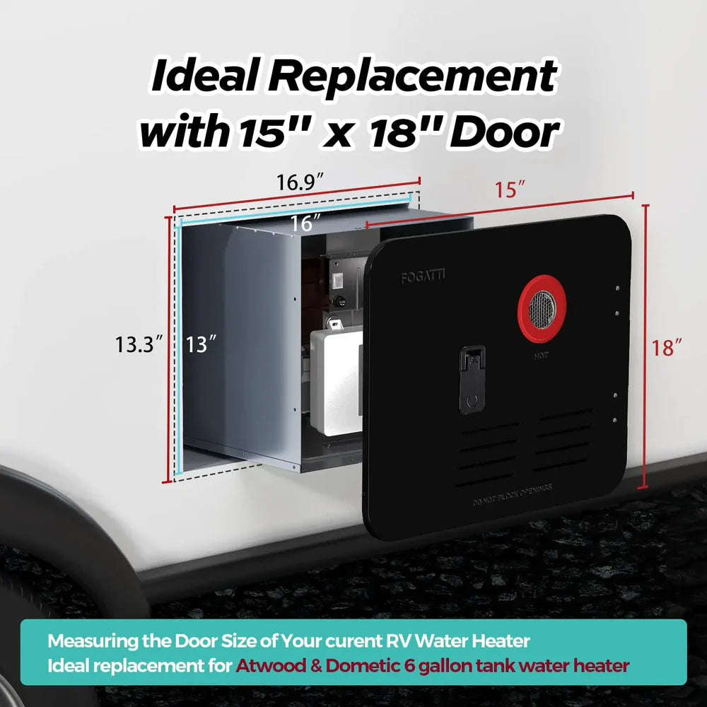 Designed for flexibility and long-term reliability, it features anti-freeze protection, high-altitude functionality up to 9,800 ft, and a built-in pressure relief valve for safe, all-season performance. The compact 15″ × 15.4″ enclosure installs easily in most standard RV water heater spaces and is compatible with your existing 15" × 15" access door (sold separately).