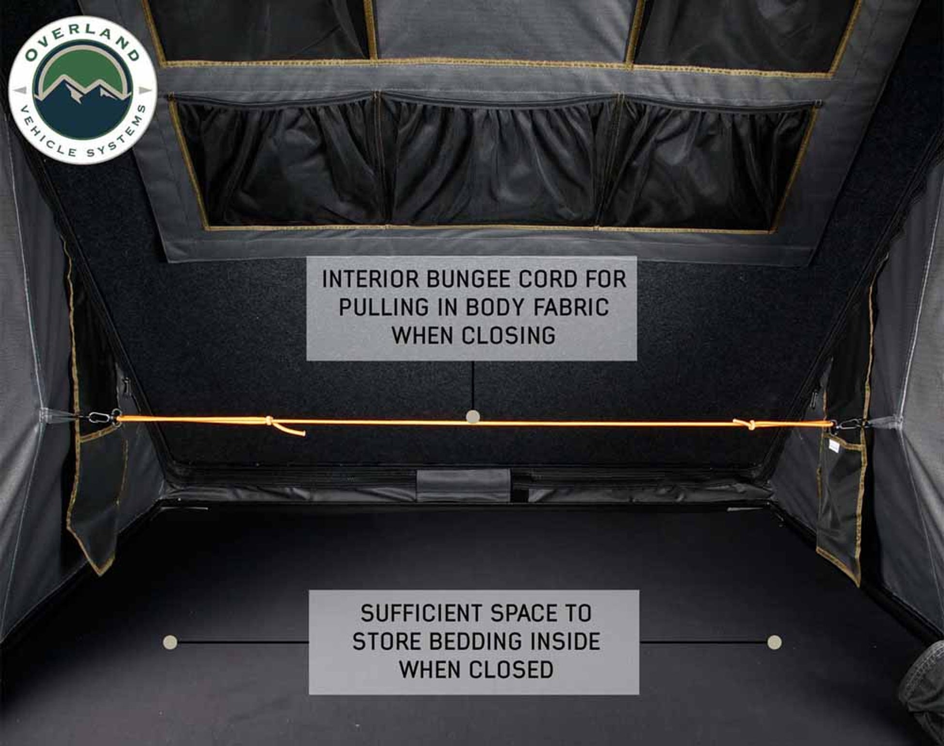 Built for serious overlanders, this tent boasts a 280g rip-stop poly-cotton waterproof body, blackout-resistant 120g breathable window screens, and two nitrogen-gas struts plus an interior pop-up support strut for added structural integrity. The built-in T-slot accessory channels and removable cross-bars (100-lb load rating) expand your storage options, while functional pockets and flexible interior storage ensure your gear stays organized.